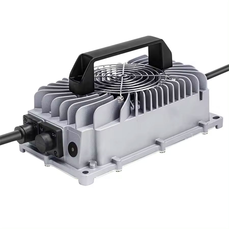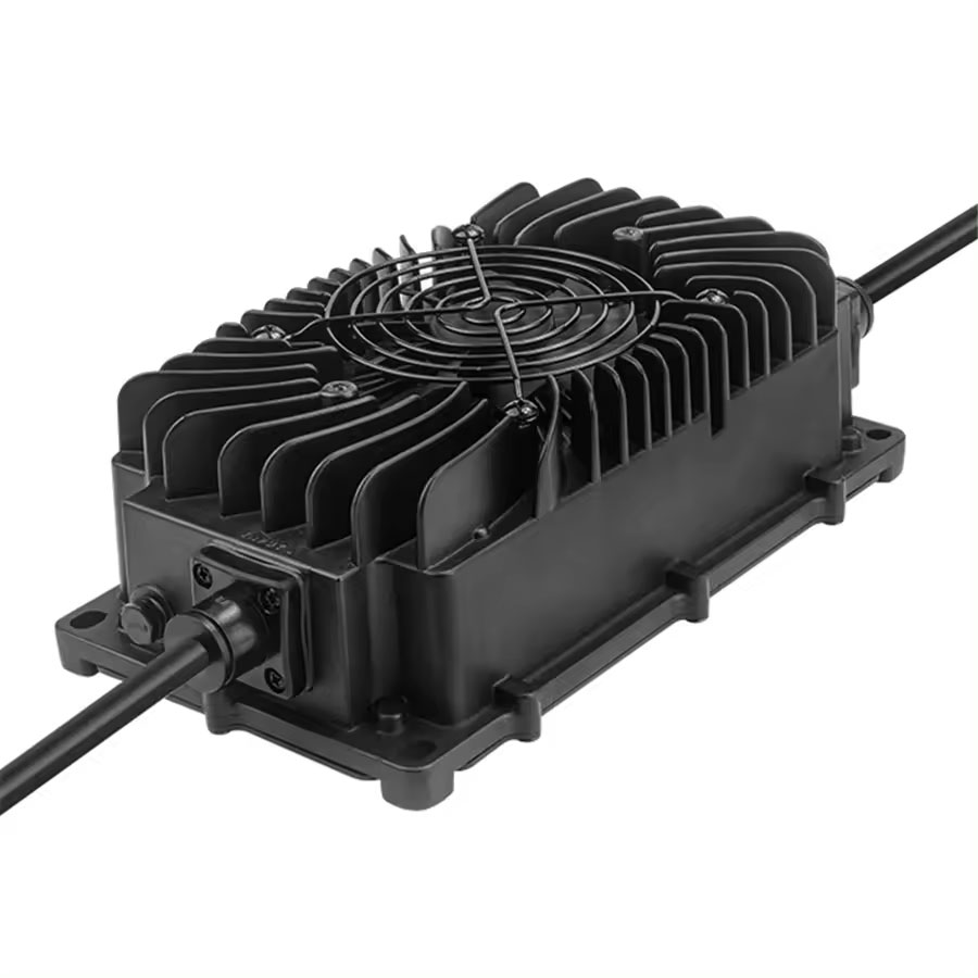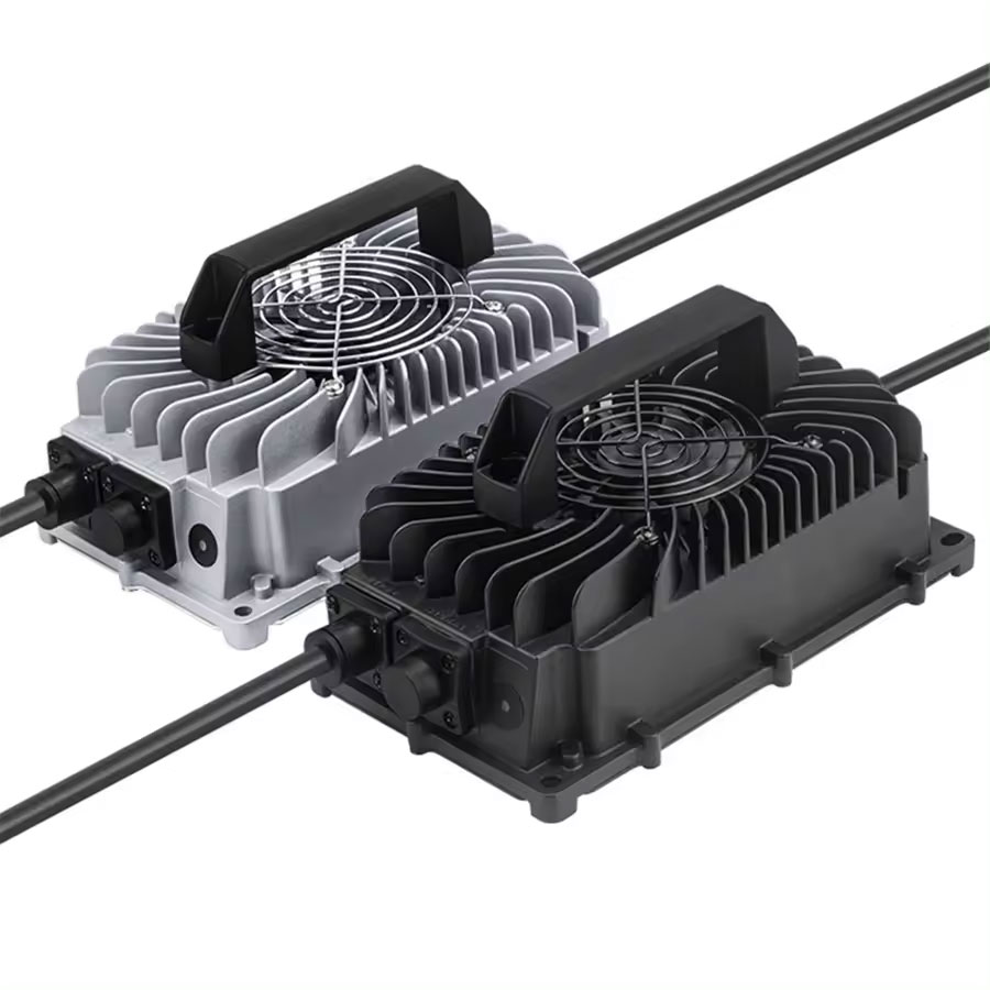 This charger adopts MCU and PWM,able to set the optimal charging curve according to battery information.With active PFC and LLC half-bridge circuit ,the charger is high-efficiency, more stable and more safer.Fully sealed aluminum die-cast enclosure and internal padding,to be waterproof,dustproof and shockproof.Three-color LED indicator can be programmed for different charging states.The fan can adjust speed automatically.